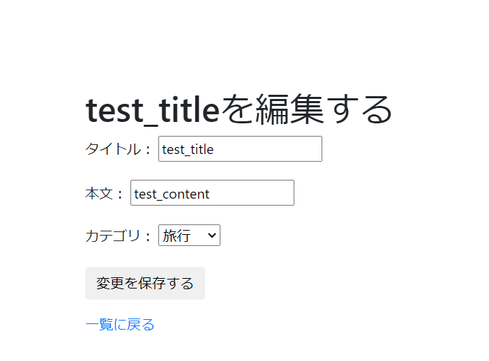 記事更新画面を開いた時には現在の値が入っていると便利なため、edit関数では現在値を取得してビューに渡しています。