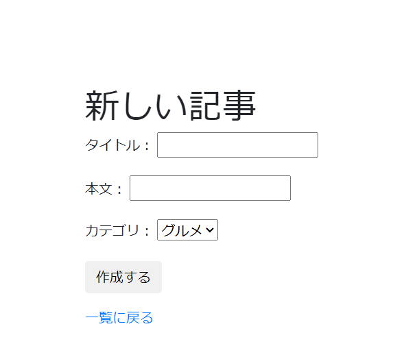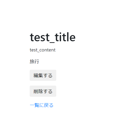 ここで、タイトル:add_test_title, 本文:add_test_content, カテゴリ:グルメ、として作成ボタンをクリックすると、一覧画面のイメージにあった記事が確認できます。